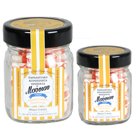 Απολαύστε τη ζουμερή γεύση των παραδοσιακών καραμελών ροδάκινο από τα Παραδοσιακά Χειροποίητα Προϊόντα Μούσιου. Φτιαγμένες με ζάχαρη, γλυκόζη, κρεμόριο και φυσικό άρωμα ροδάκινου, προσφέρουν μια γυαλιστερή υφή που λιώνει στο στόμα. Η χειροποίητη διαδικασία εξασφαλίζει την αυθεντική ποιότητα. Διαθέσιμες σε γυάλινα βάζα 200γρ και 100γρ, είναι ιδανικές για κάθε περίσταση.