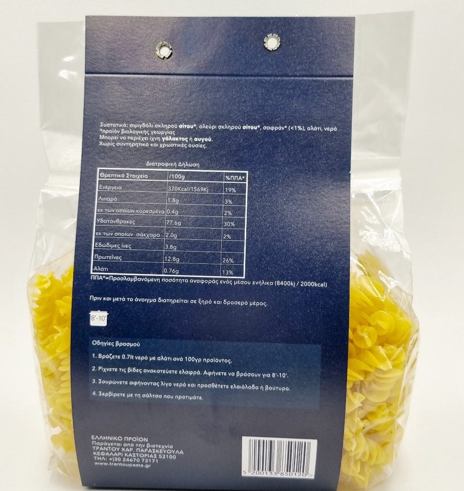 Ανακαλύψτε τις παραδοσιακές βίδες ΤΡΑΝΤΟΥ, φτιαγμένες από 100% αγνά υλικά. Παρασκευάζονται από σκληρό σιτάρι και εμπλουτίζονται με το πολύτιμο σαφράν, προσφέροντας μοναδική γεύση και χρυσαφένιο χρώμα στα πιάτα σας. Ιδανικές για να συνοδεύσουν κάθε γεύμα, αυτές οι βίδες είναι μια εξαιρετική επιλογή για όσους αναζητούν ποιότητα και αυθεντική γεύση.