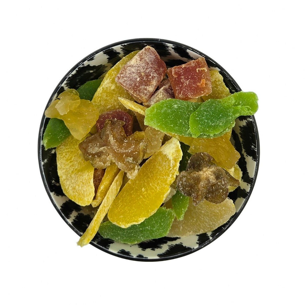 Η Τροπική Σαλάτα Αποξηραμένων Φρούτων με Ζάχαρη είναι ένας απολαυστικός συνδυασμός τροπικών φρούτων, ιδανικός για όσους αναζητούν μια γλυκιά εναλλακτική στα καθημερινά σνακ. Αυτό το μιξ περιλαμβάνει αποξηραμένα και ζαχαρωμένα φρούτα όπως ανανάς, παπάγια και starfruit, επεξεργασμένα με προσοχή για να διατηρούν τη φυσική τους γεύση και υφή. Ιδανικό για λάτρεις των αποξηραμένων φρούτων που θέλουν ποικιλία σε κάθε μπουκιά,.